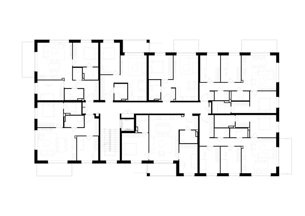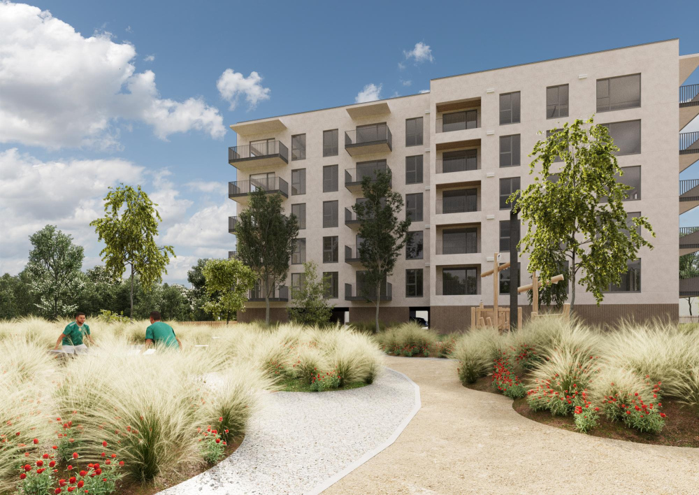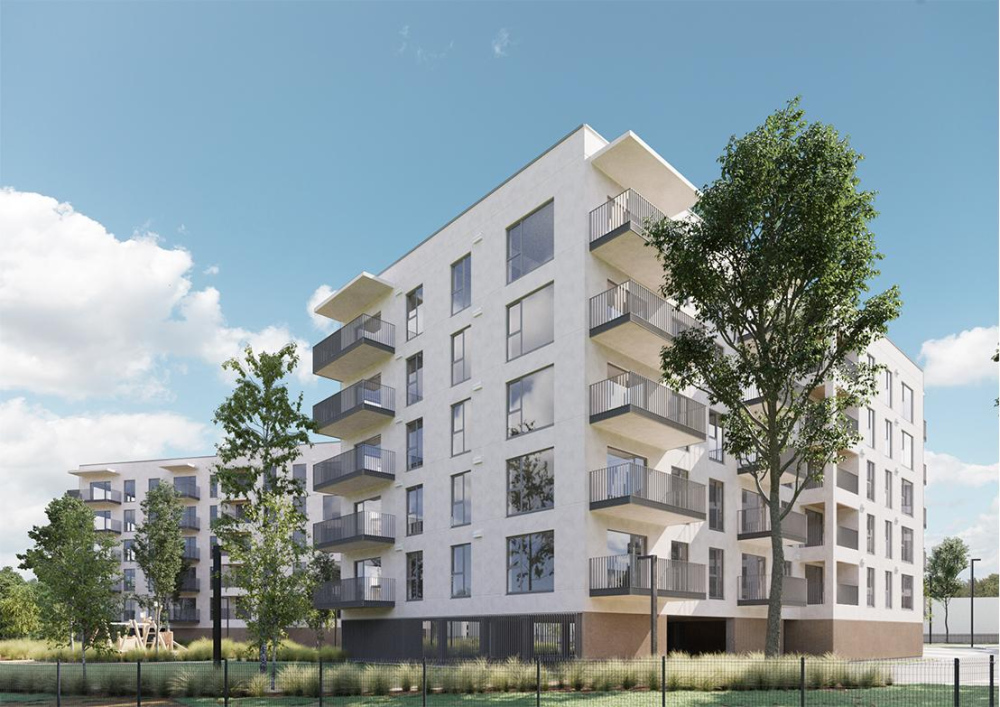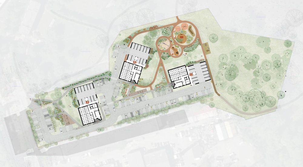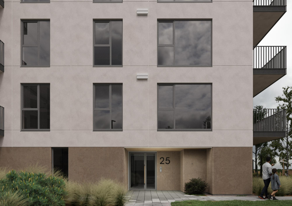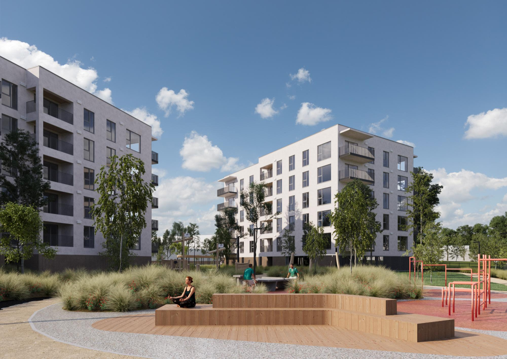 Rectangular volumes with flat roofs and large windows connect indoor and outdoor spaces, while landscaped courtyards provide play areas, and quiet zones for residents of all ages. Clear entrances and efficient circulation ensure ease of use, and preserved greenery enhances the site’s natural character. The result is a compact, thoughtful residential development that balances urban living with nature.